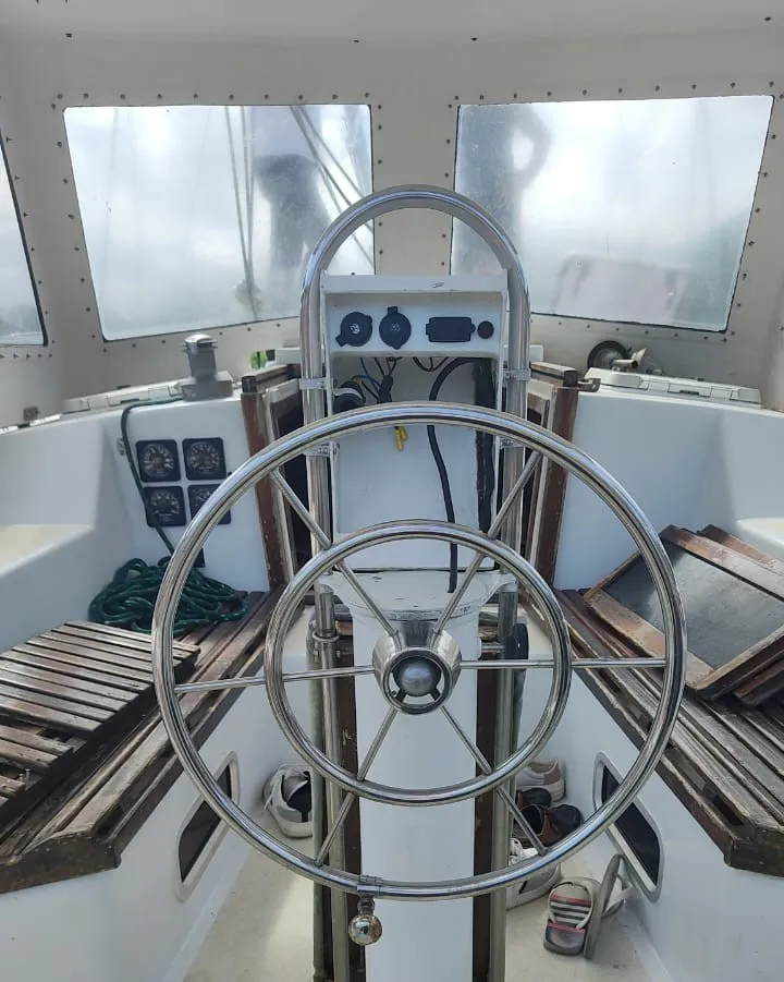 02 rodas de leme em inox (uma pequena para manobra e uma de 1,2m para velejar)