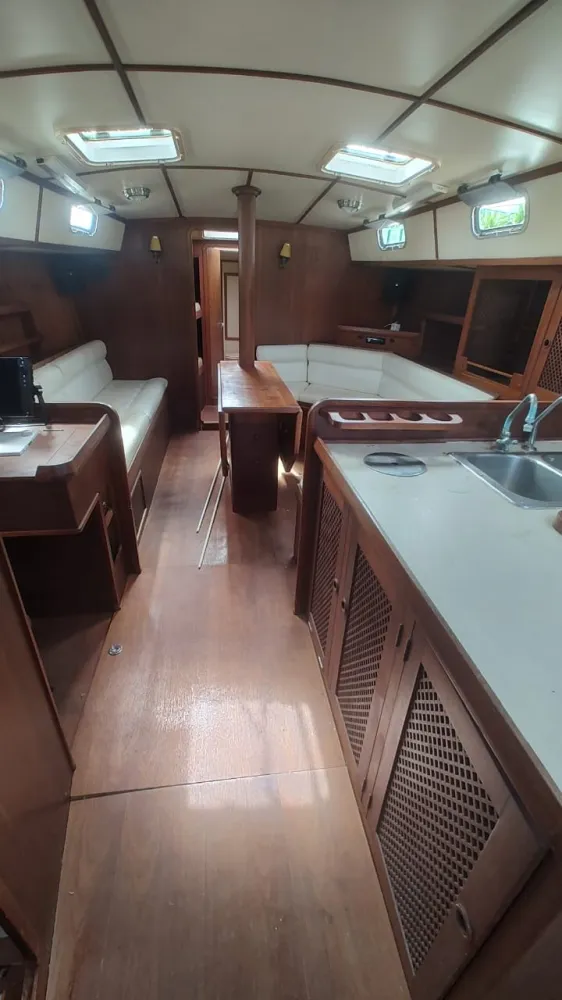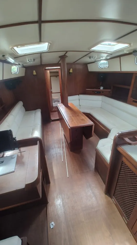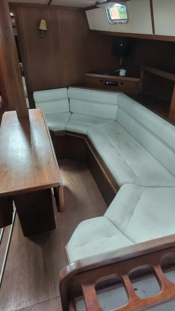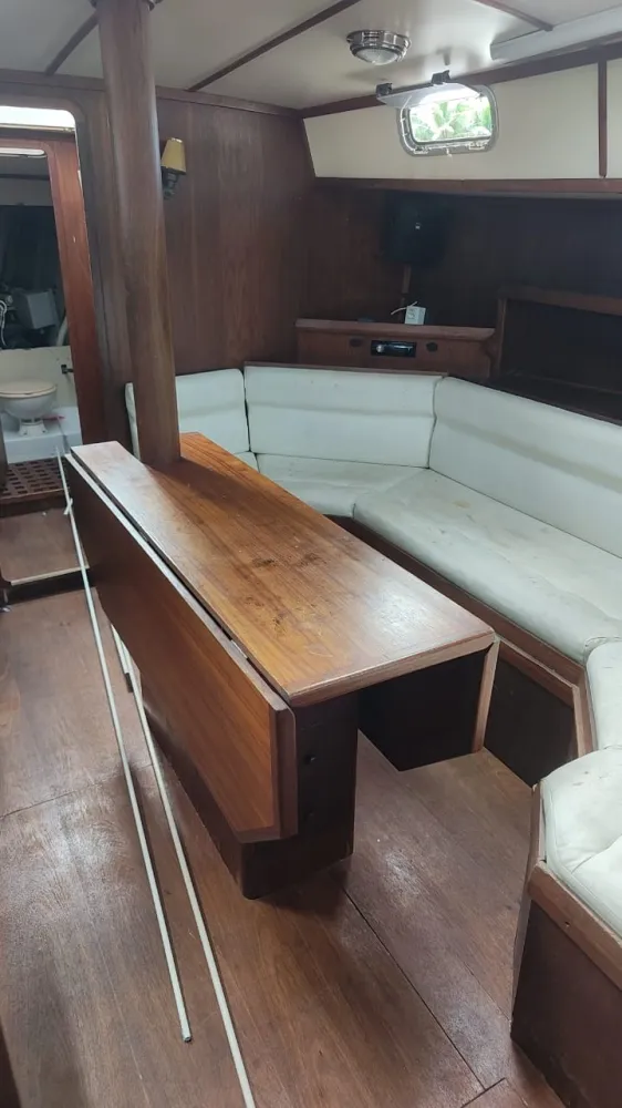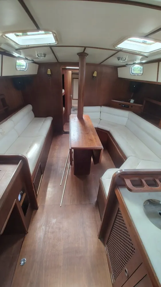 Dinette com enorme mesa basculante, sofá em “C” reversível em cama de casal a boreste e outro sofá a bombordo