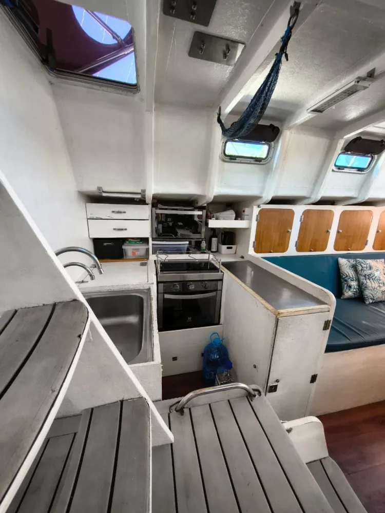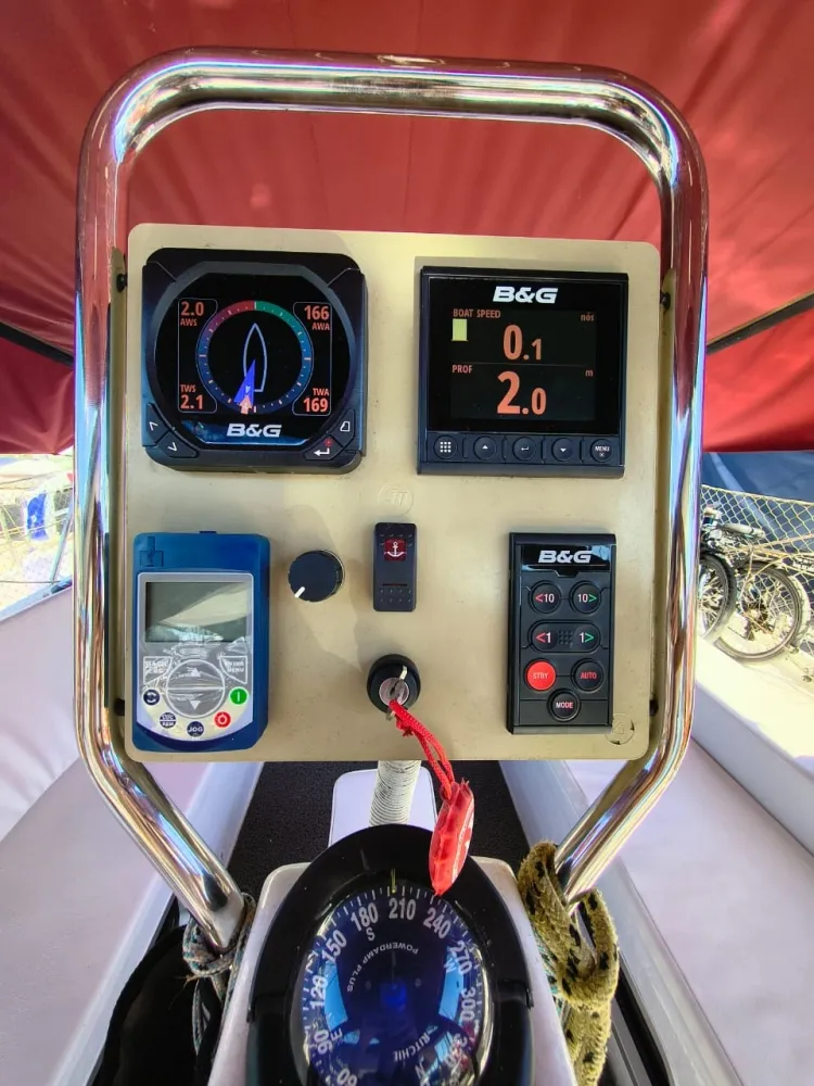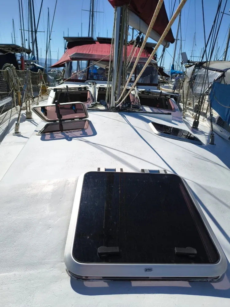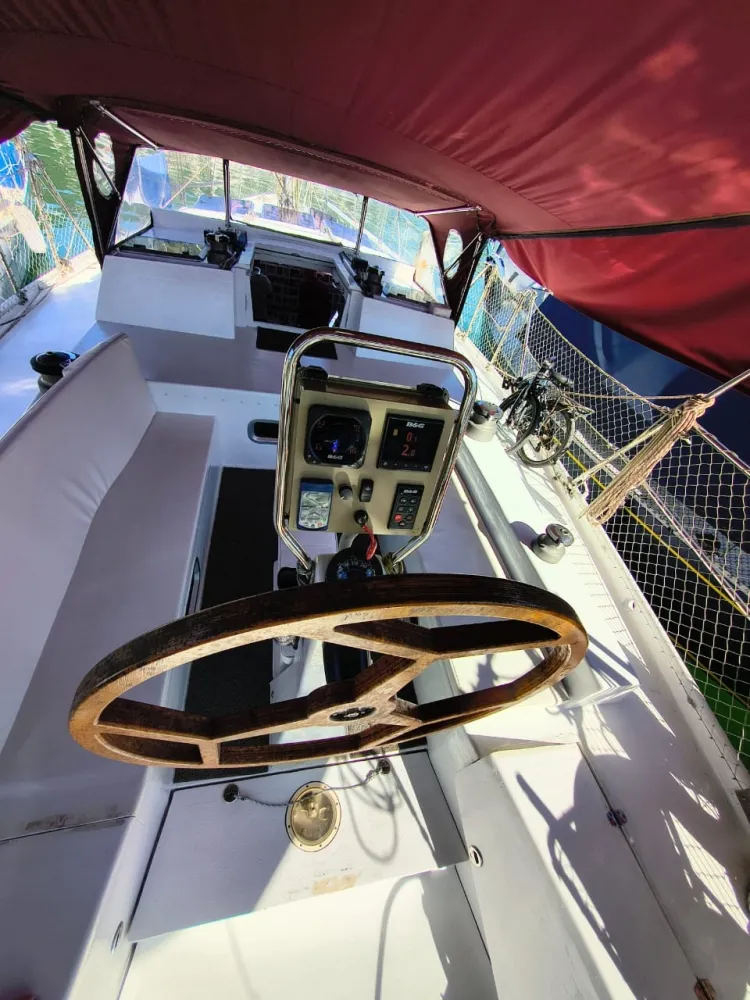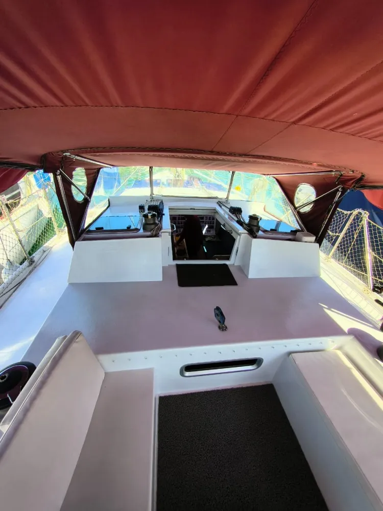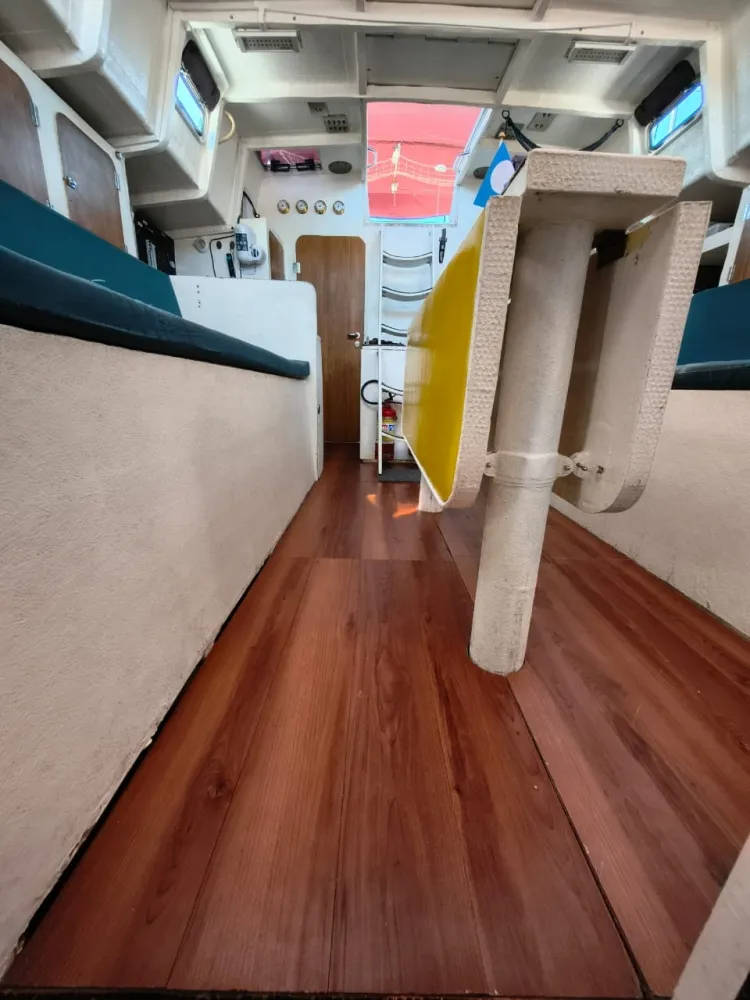 Construído em sanduíche de fibra de vidro (com miolo de colméia Nidacor de 30 mm no casco e convés) + 2 camadas de tecido biaxial 0/90 e 45/45 + 2 mantas de 450 e 300) de cada lado. Restante da construção também em sanduíche.