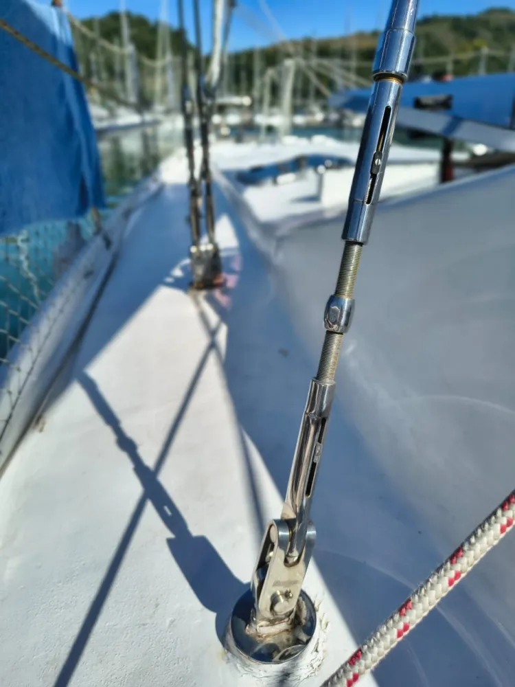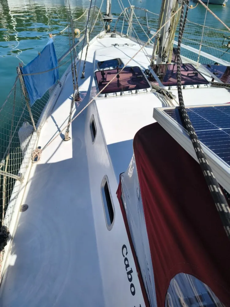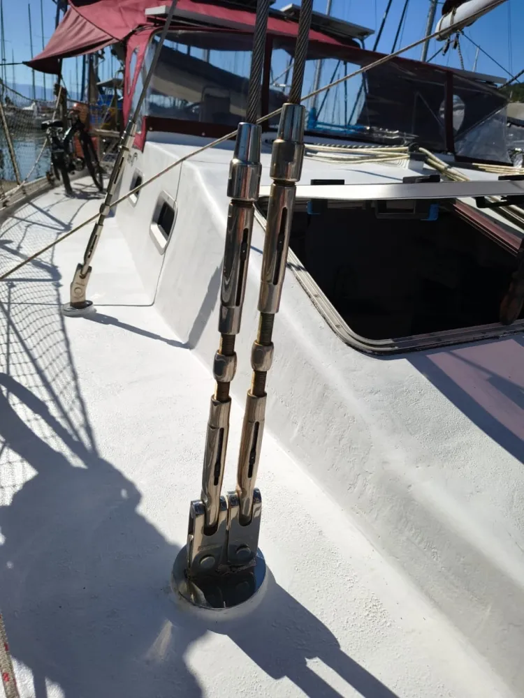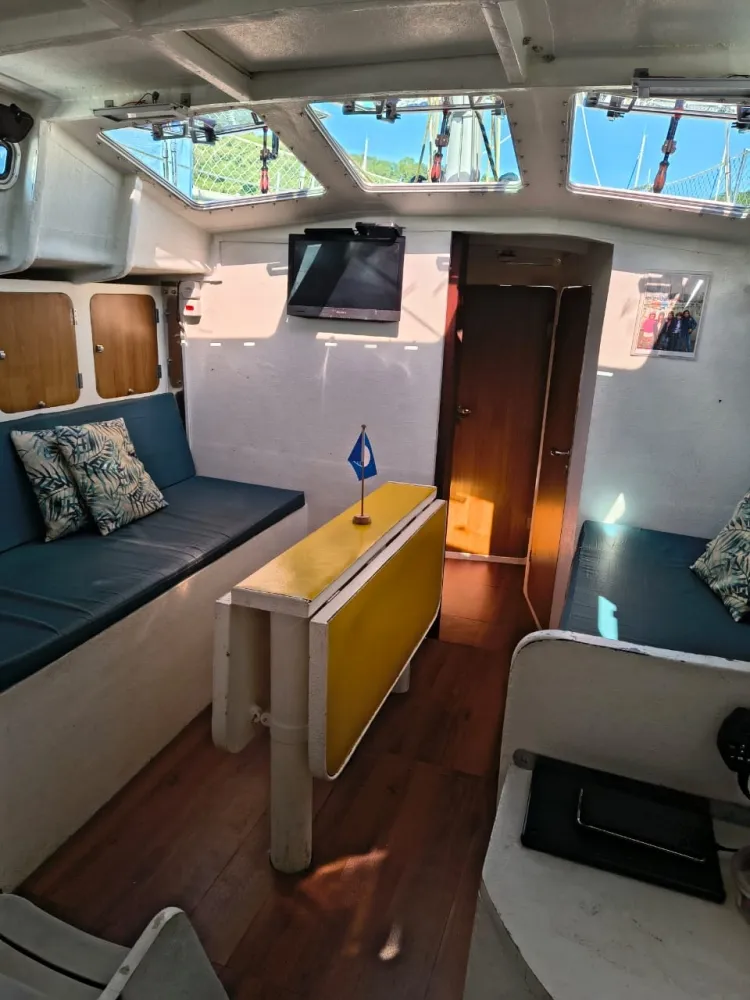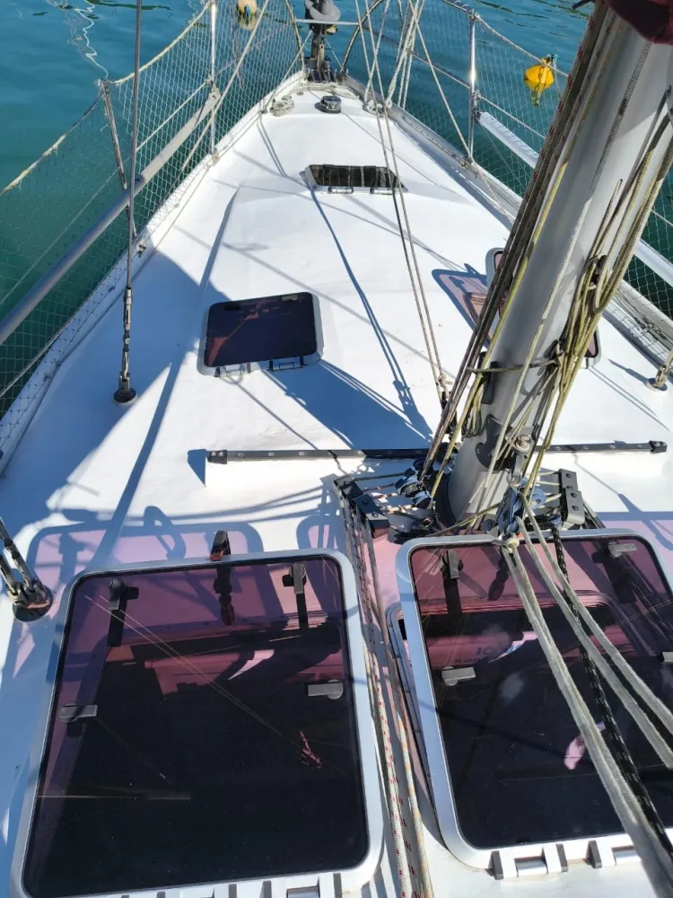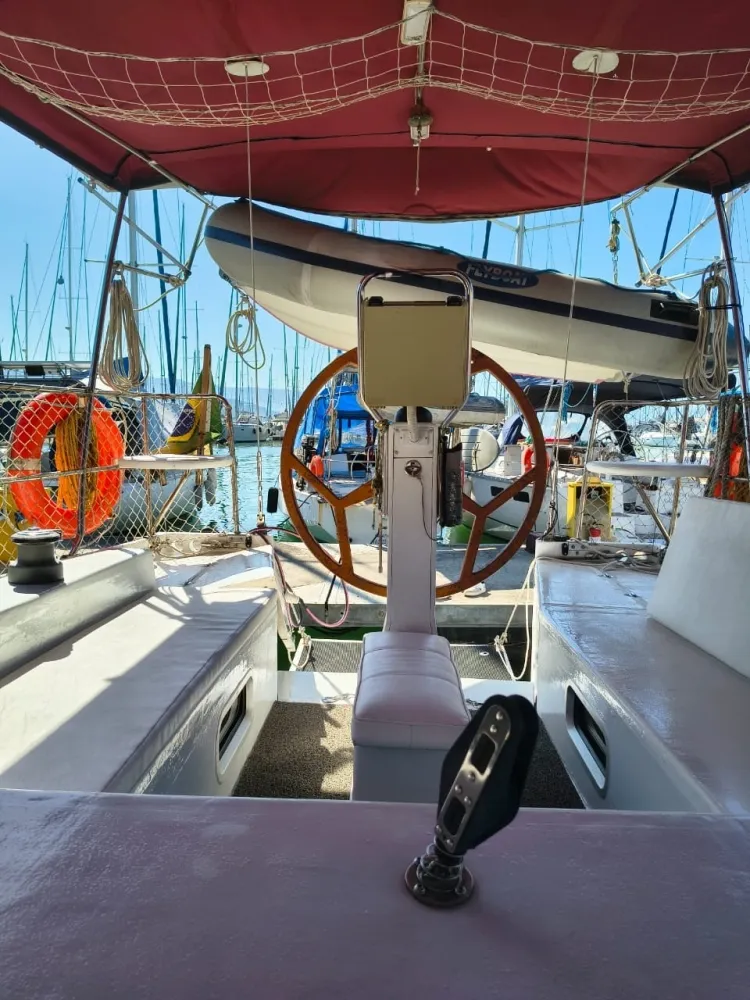 Construído em sanduíche de fibra de vidro (com miolo de colméia Nidacor de 30 mm no casco e convés) + 2 camadas de tecido biaxial 0/90 e 45/45 + 2 mantas de 450 e 300) de cada lado. Restante da construção também em sanduíche.