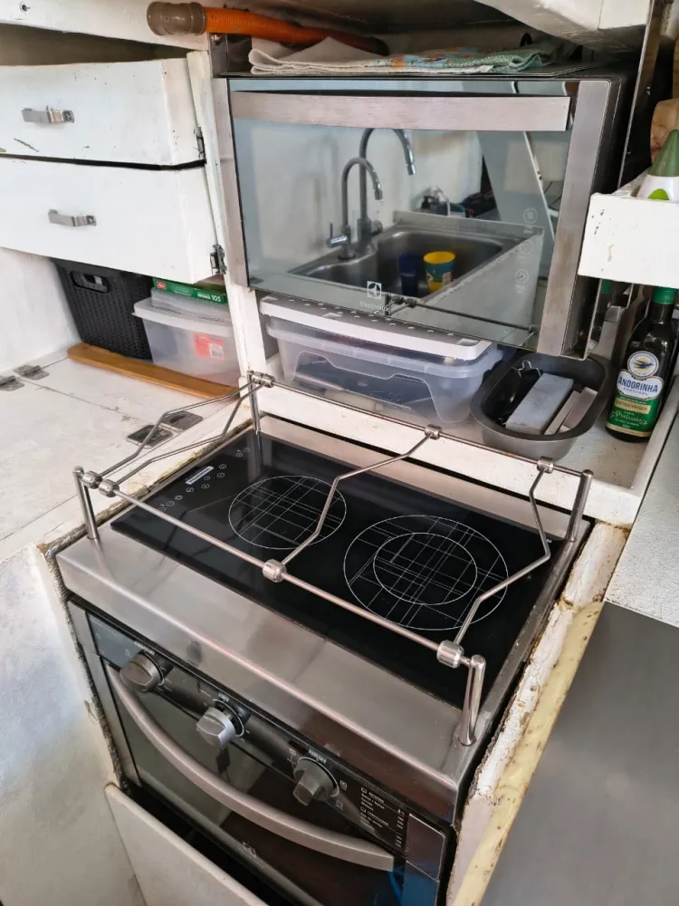 Churrasqueira inox com suporte na plataforma de popa.