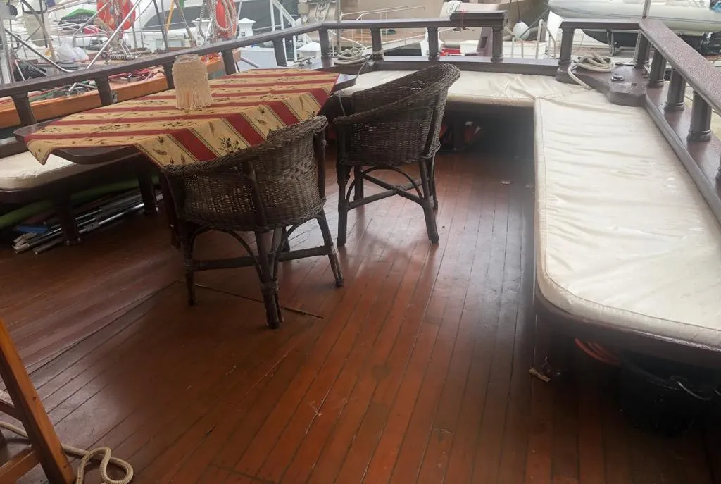 Espaçoso convés com mesa bancos ao redor e duas cadeiras de vime.