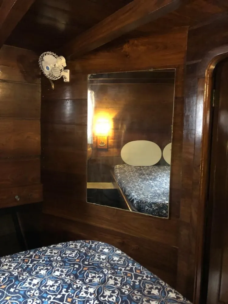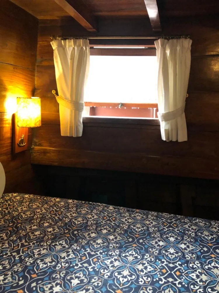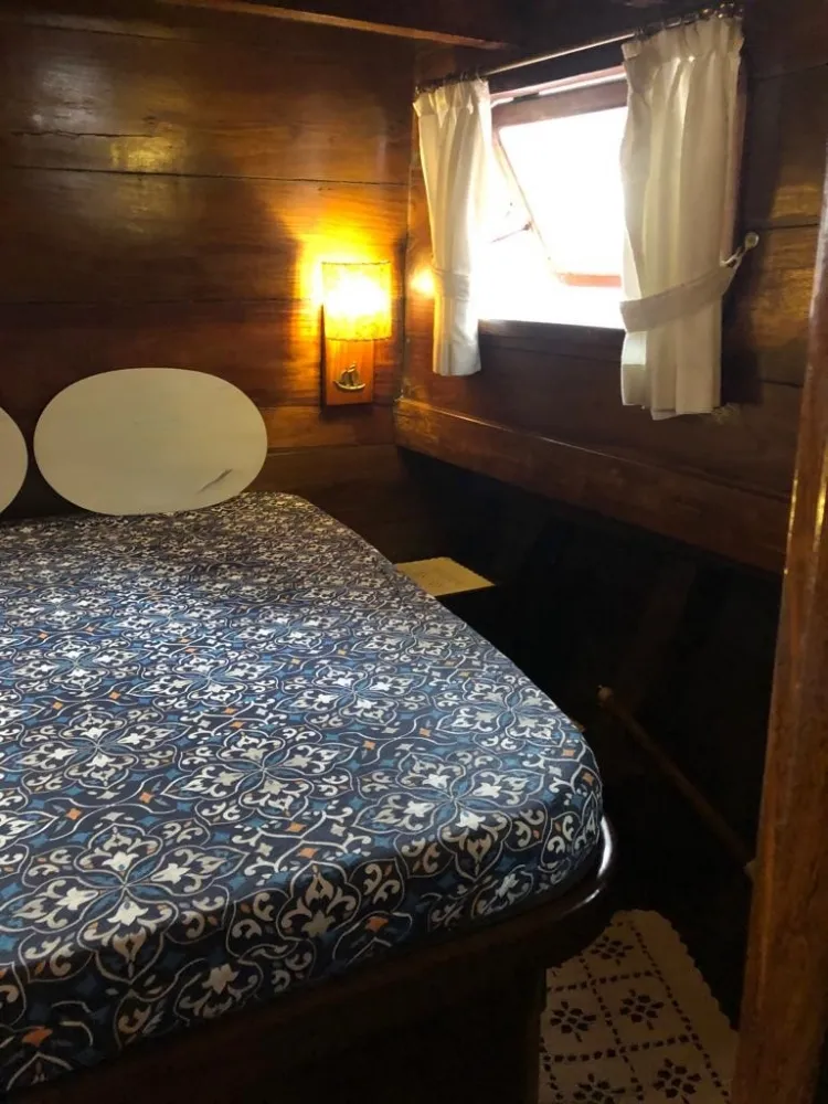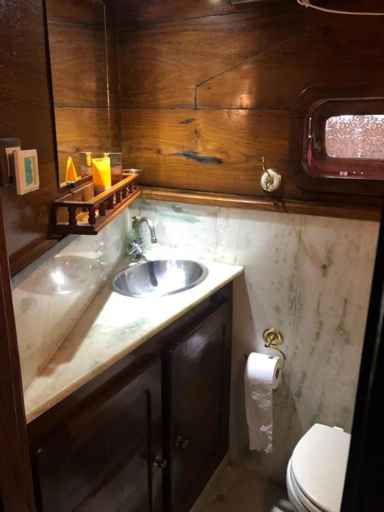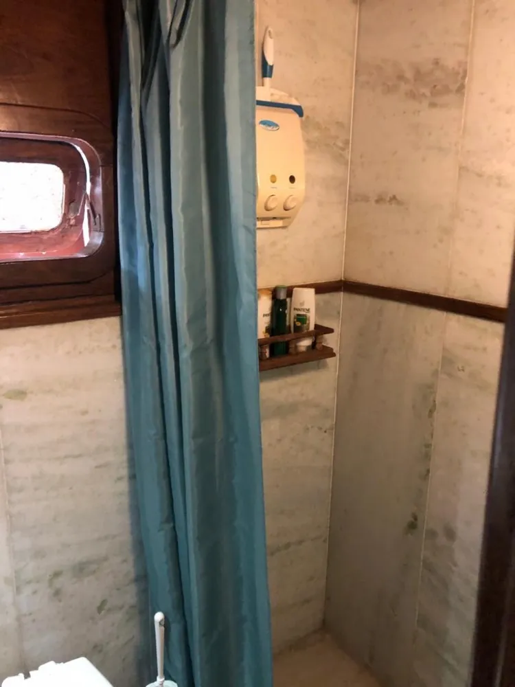 Camarote para casal, banheiro completo com chuveiro, pia e vaso sanitário