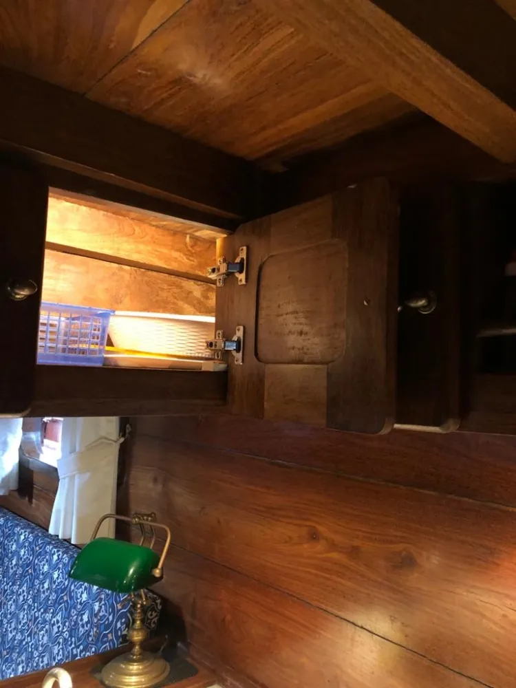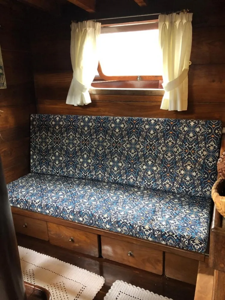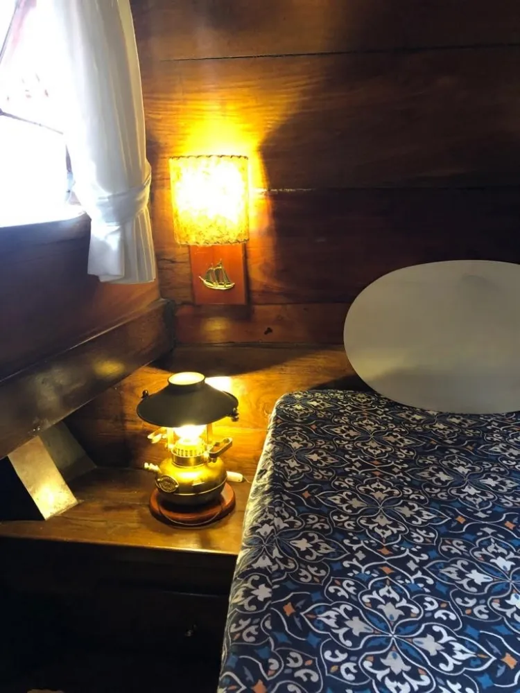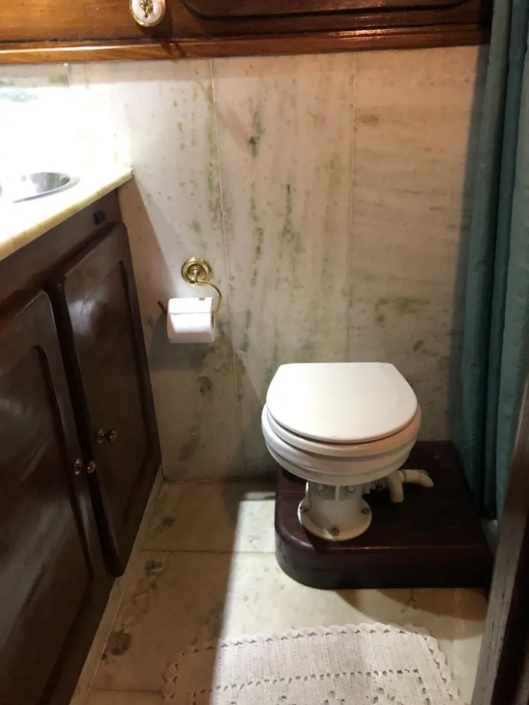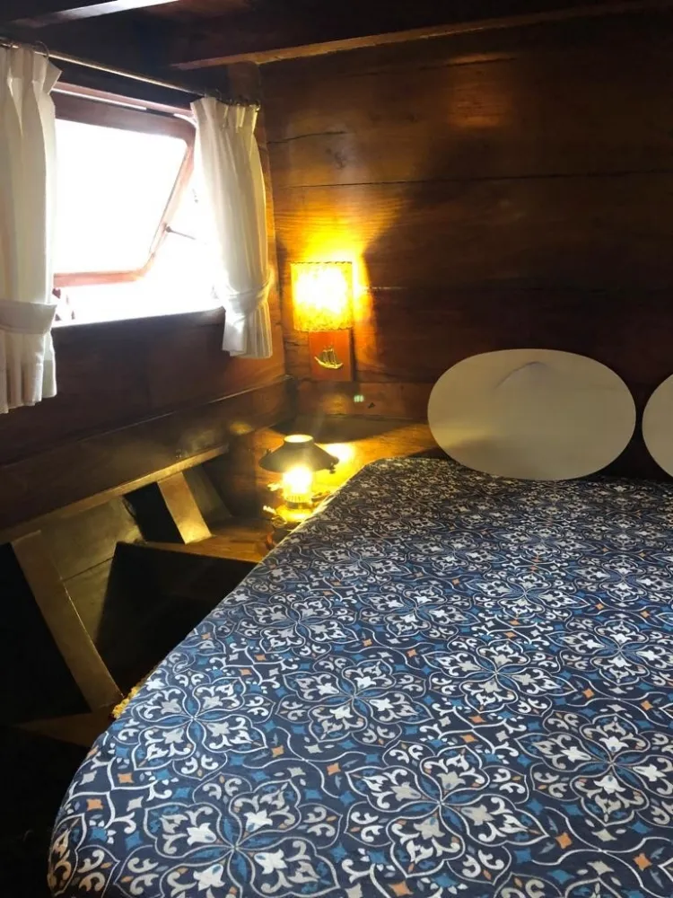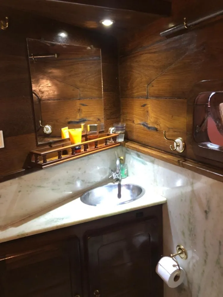 Camarote para casal, banheiro completo com chuveiro, pia e vaso sanitário