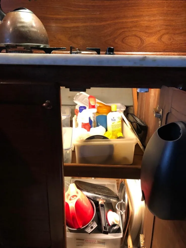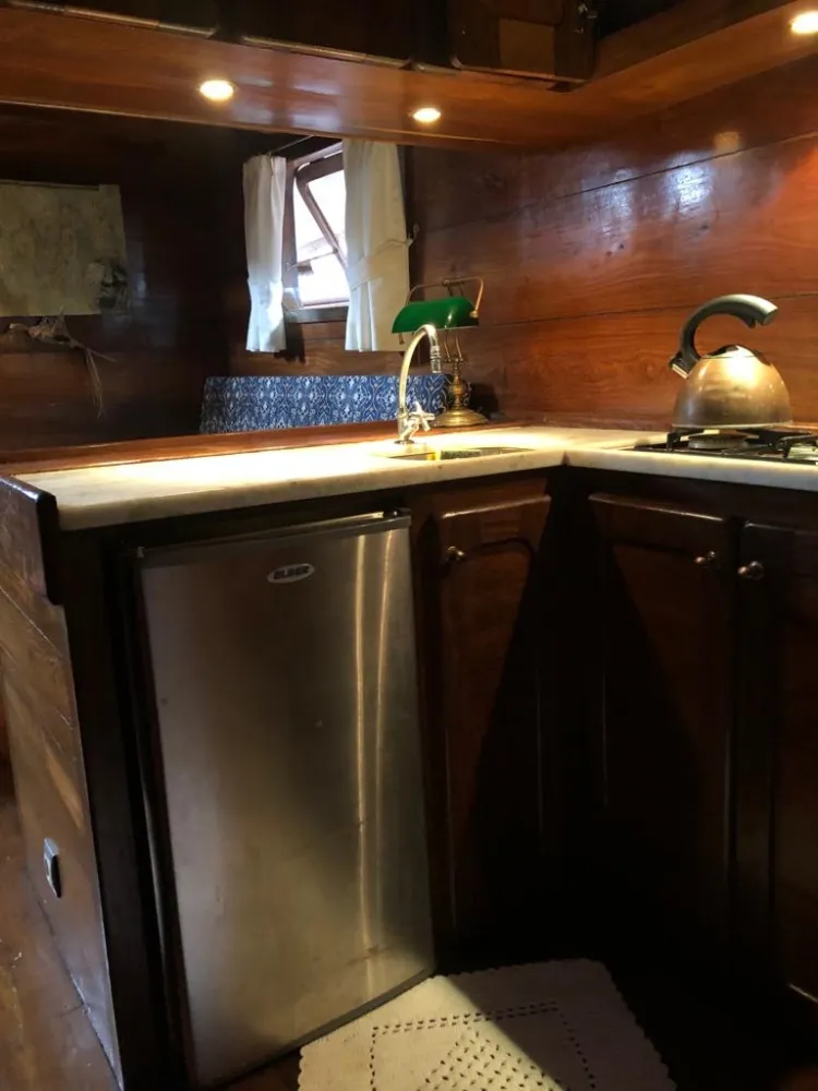 Fogão a gás (bujão de gás fica fora na pequena cozinha em um armário)